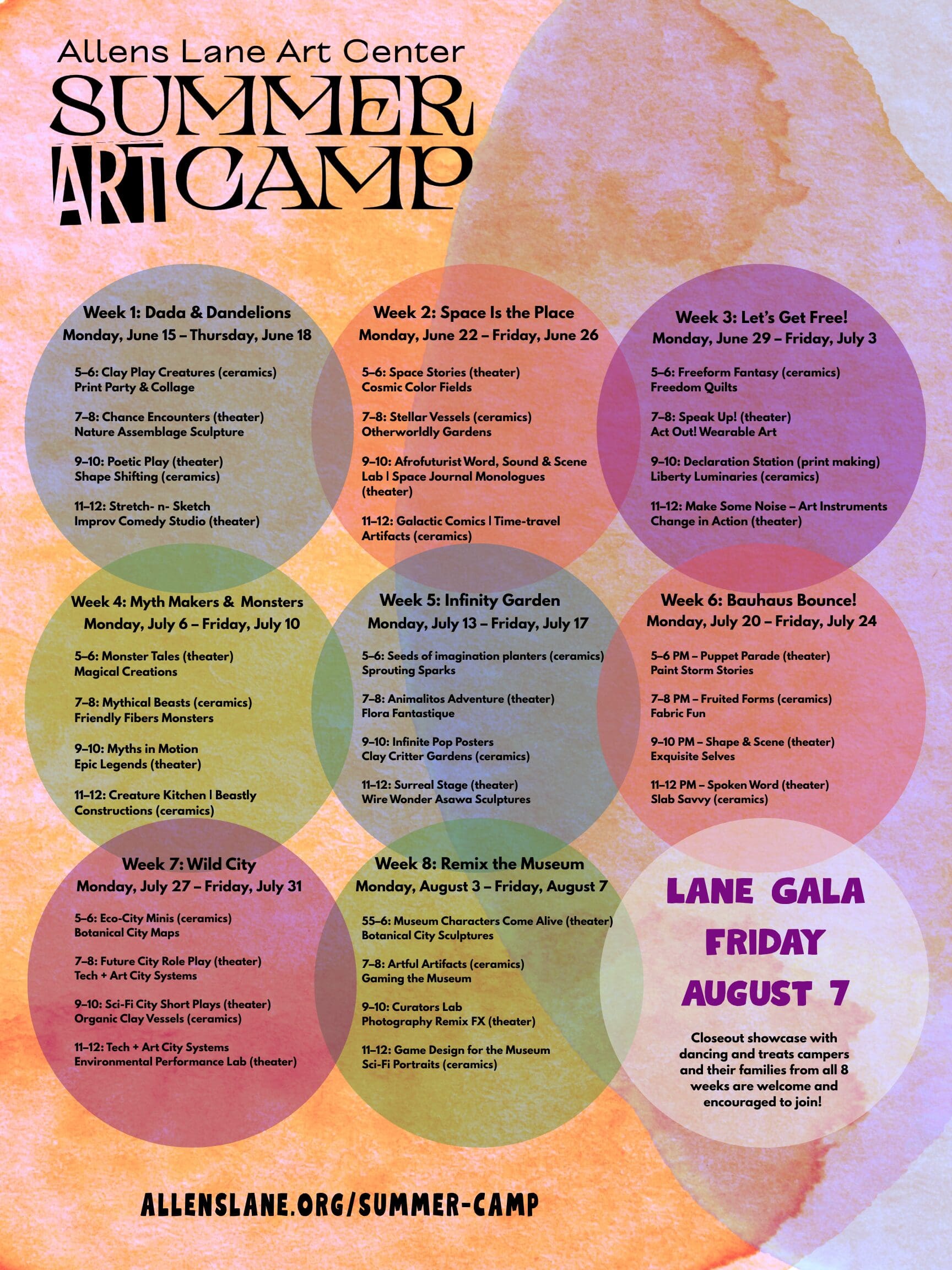 Campers will dive into full days of artistic exploration and hands-on learning, with time to enjoy the beautiful Allens Lane Park nearby. Plus, each week will culminate in a Friday afternoon showcase, where our young artists get to share their creations and celebrate their progress.
